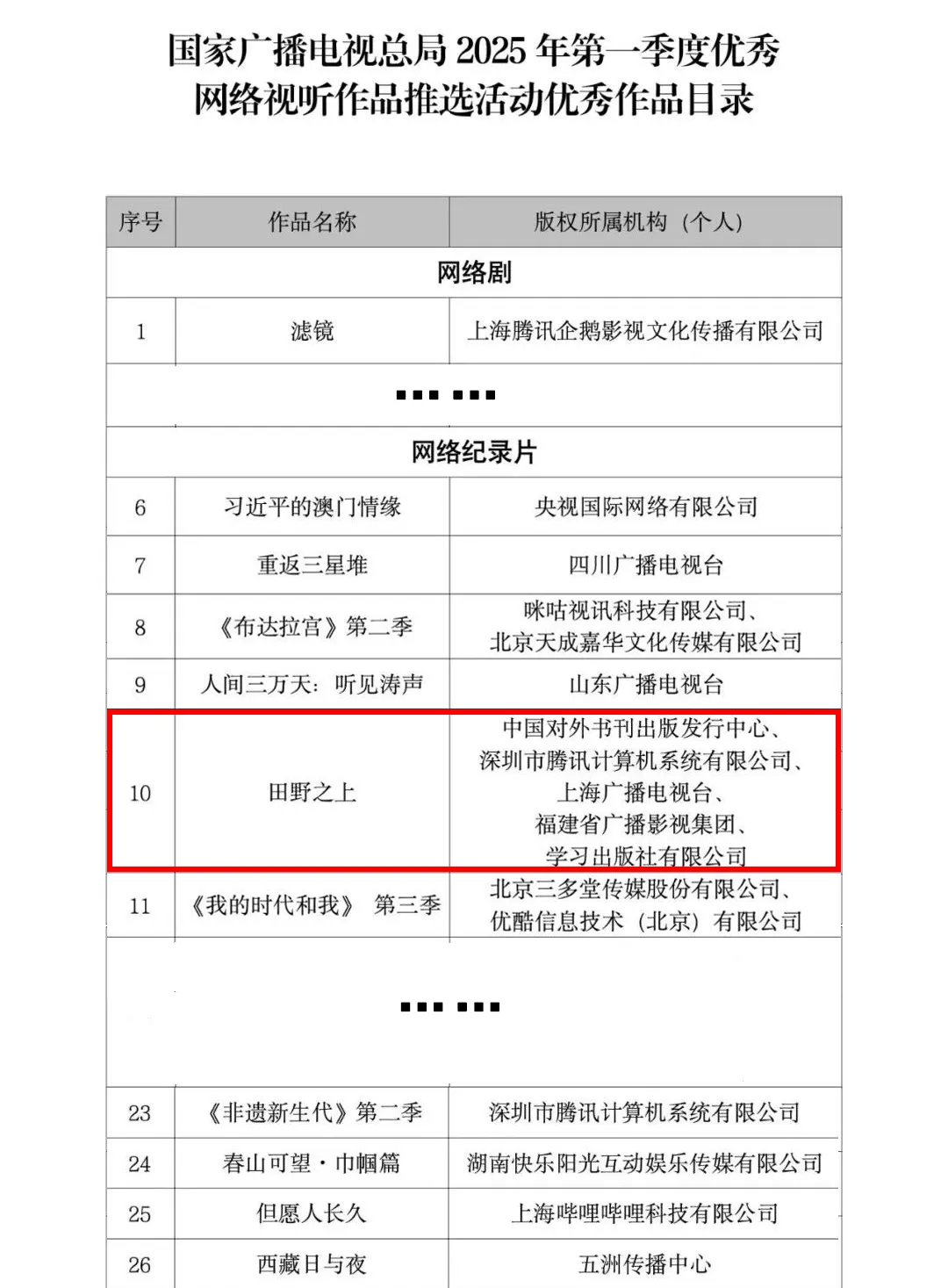 为深入学习贯彻习近平文化思想,深入实施广播电视和网络视听精品创作工程,进一步鼓励网络视听行业创作生产高质量视听内容,充分发挥优秀网络视听作品的示范引领作用,营造良好创作传播生态,国家广播电视总局近期组织开展了2025年第一季度优秀网络视听作品推选活动。经省级广电行政部门和中央直属单位等推荐,专家评审委员会评审等程序,最终研究确定99部作品入选。其中,由伟德国际手机移动版参与出品的《田野之上》入选优秀网络纪录片。